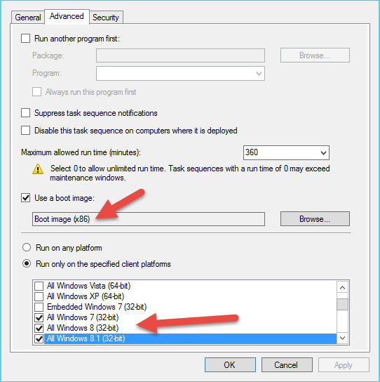 - On each Task Sequence restrict the boot image to the appropriate architecture